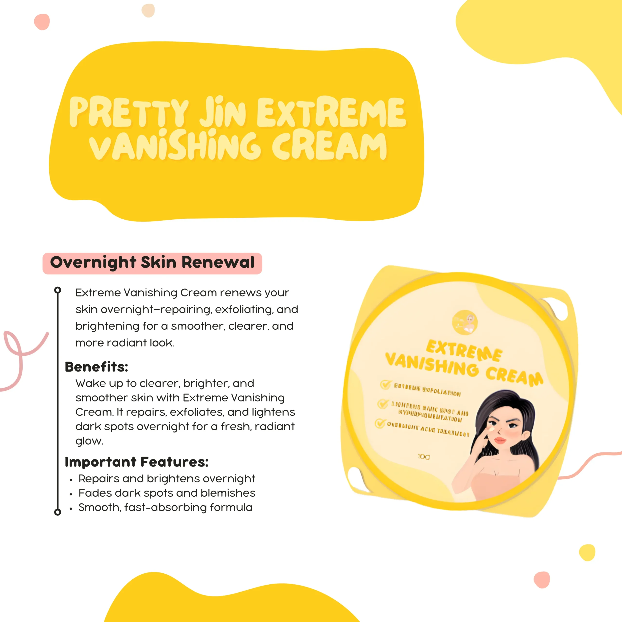 Wake up to clearer, brighter, and smoother skin with Extreme Vanishing Cream. It repairs, exfoliates, and lightens dark spots overnight for a fresh, radiant glow.