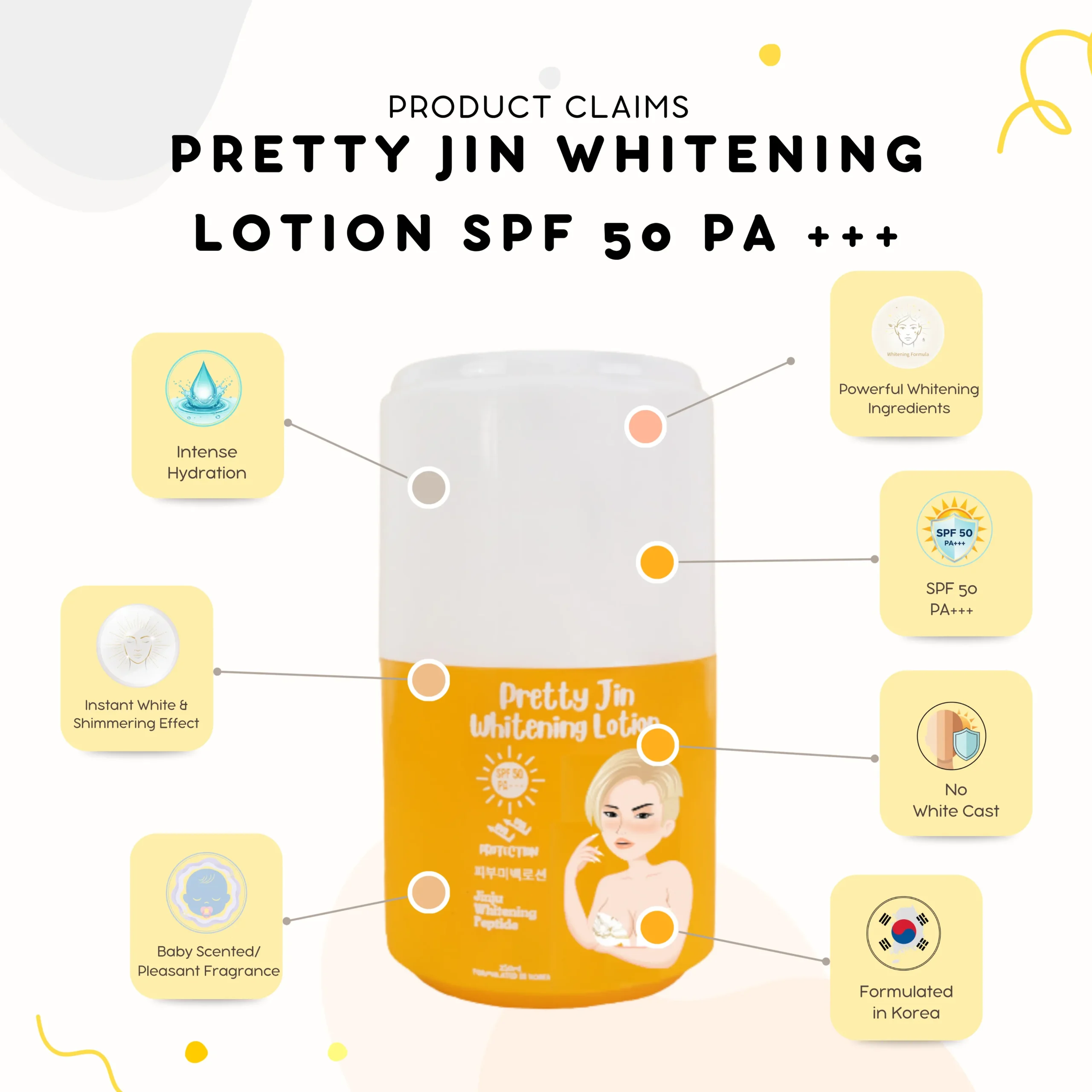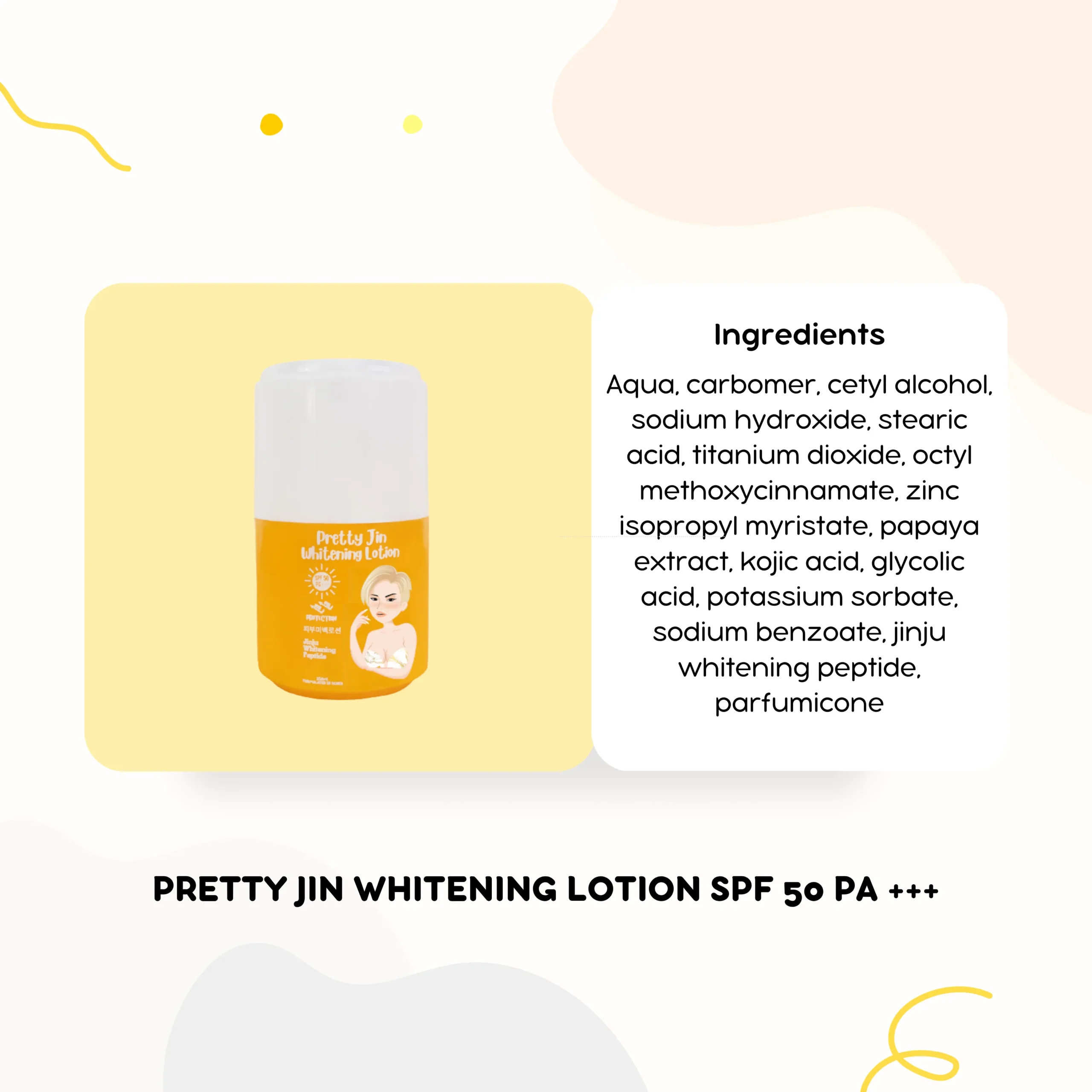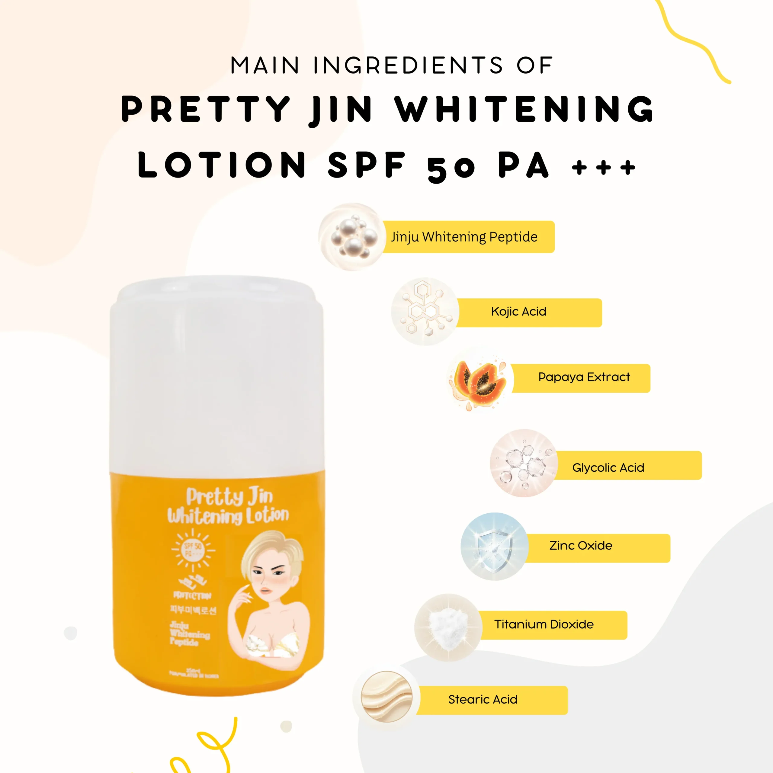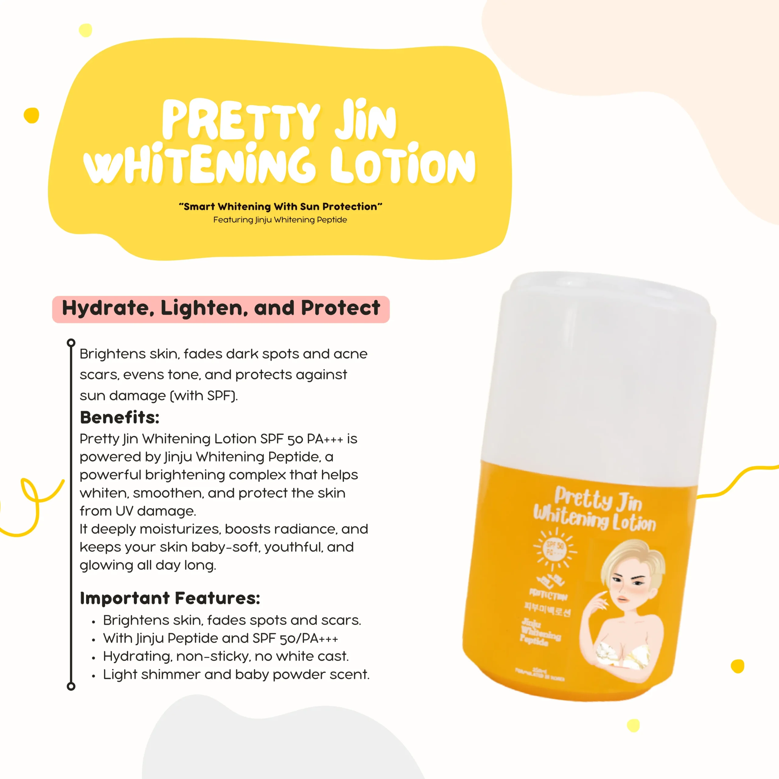 Pretty Jin Whitening Lotion SPF 50 PA+++ is powered by Jinju Whitening Peptide, a powerful brightening complex that helps whiten, smoothen, and protect the skin from UV damage.