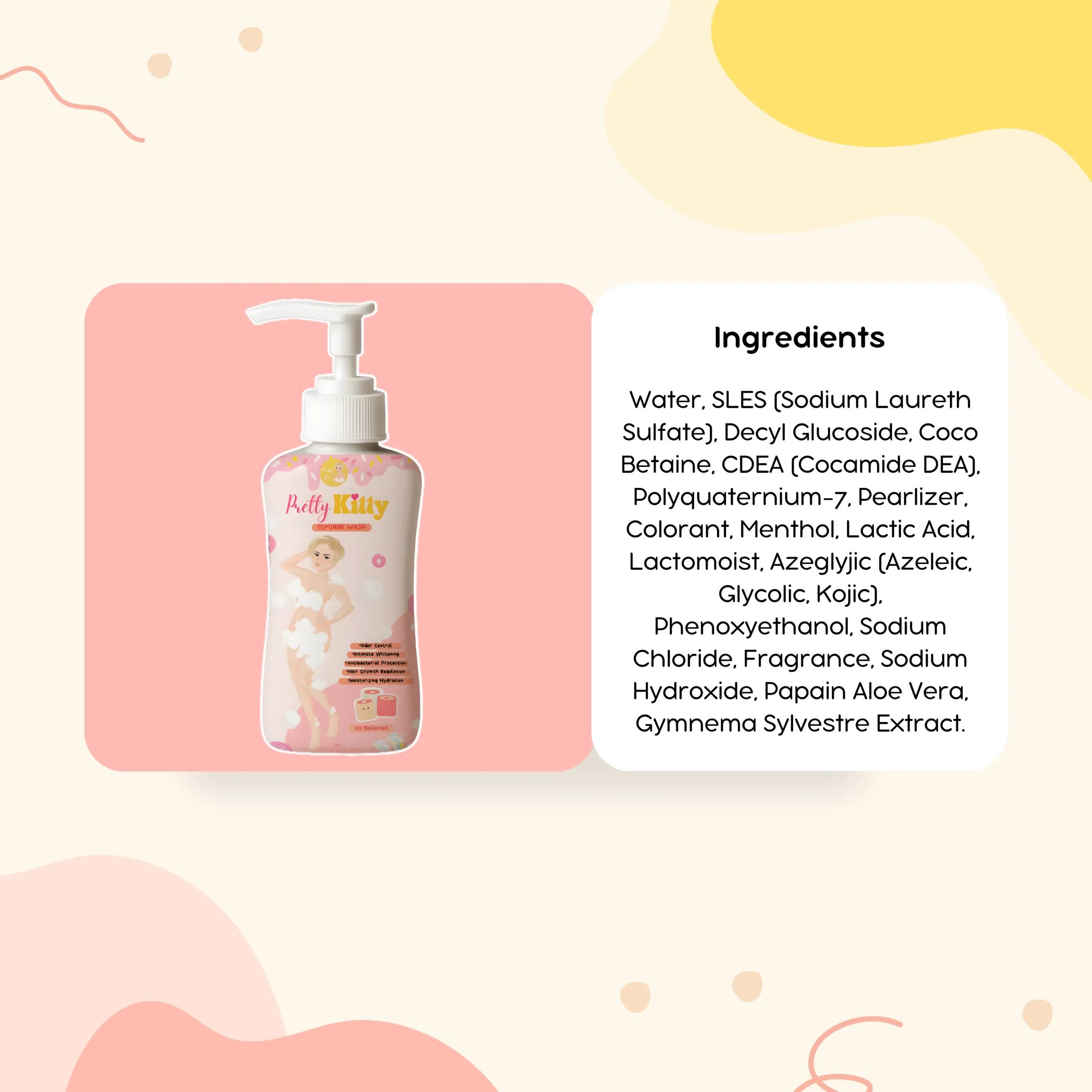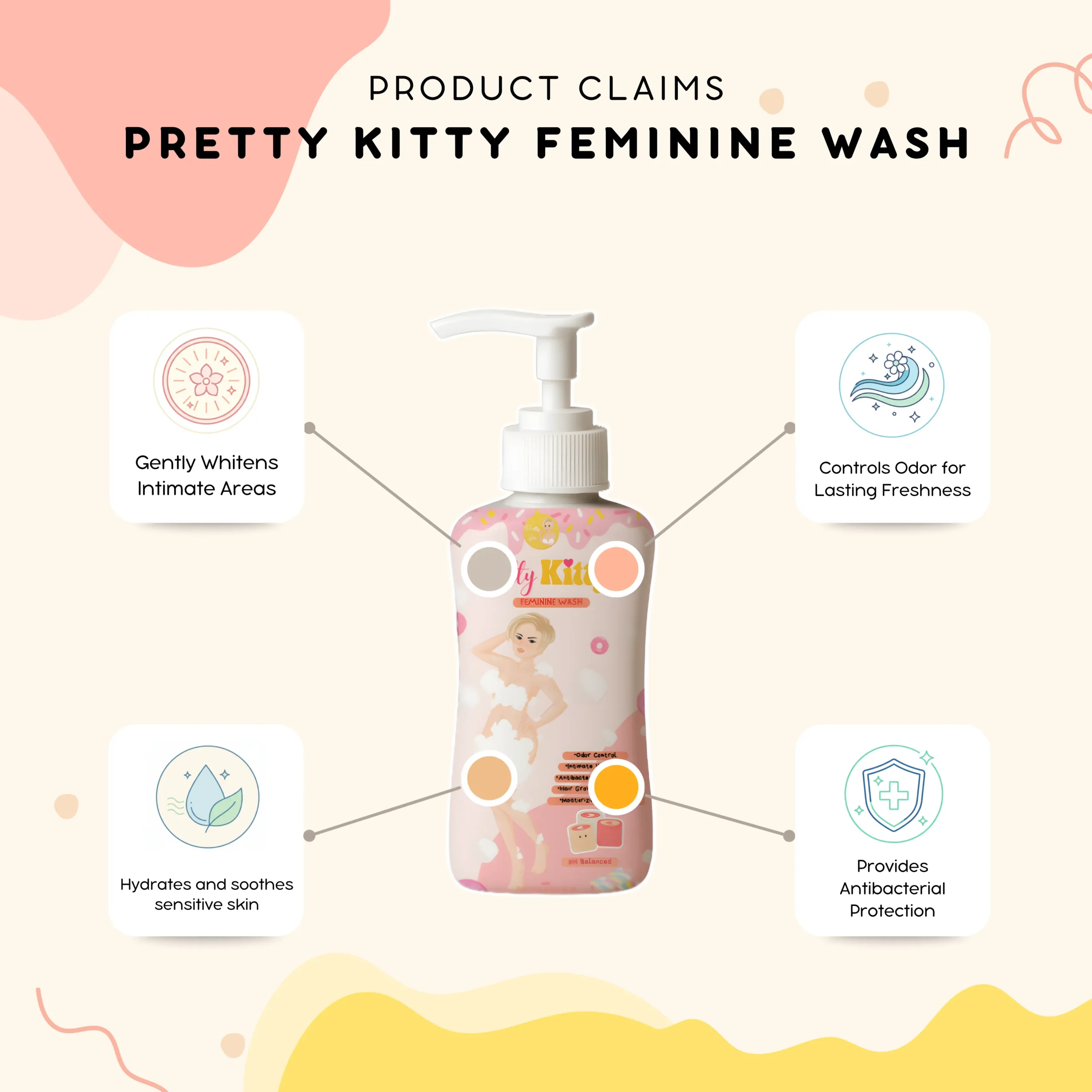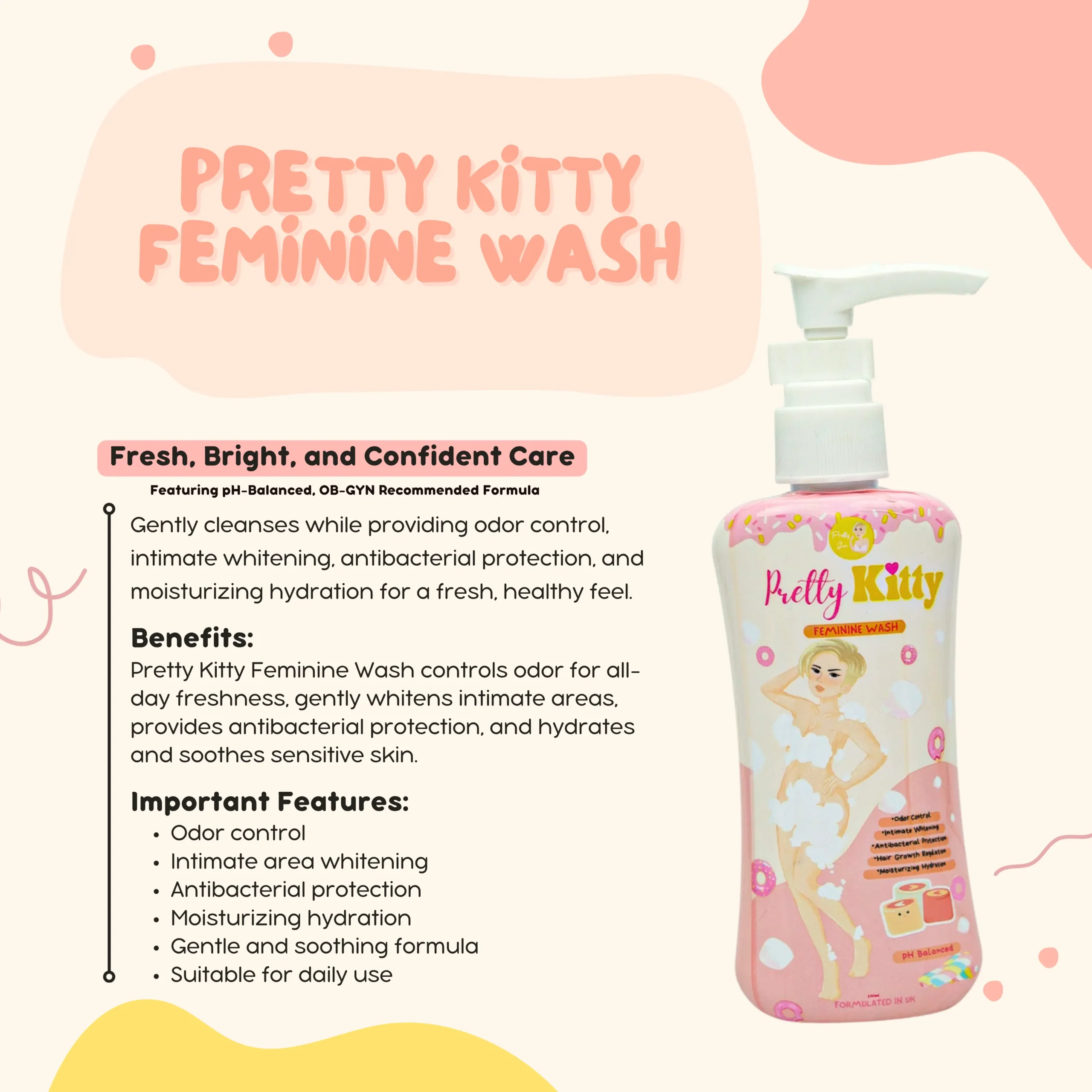 Pretty Kitty Feminine Wash controls odor for all-day freshness, gently whitens intimate areas, provides antibacterial protection, and hydrates and soothes sensitive skin.