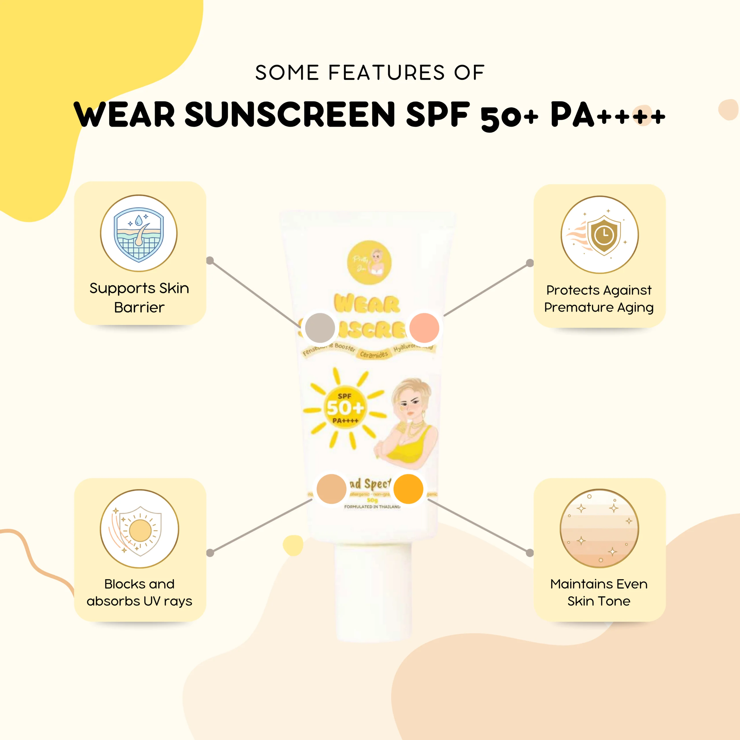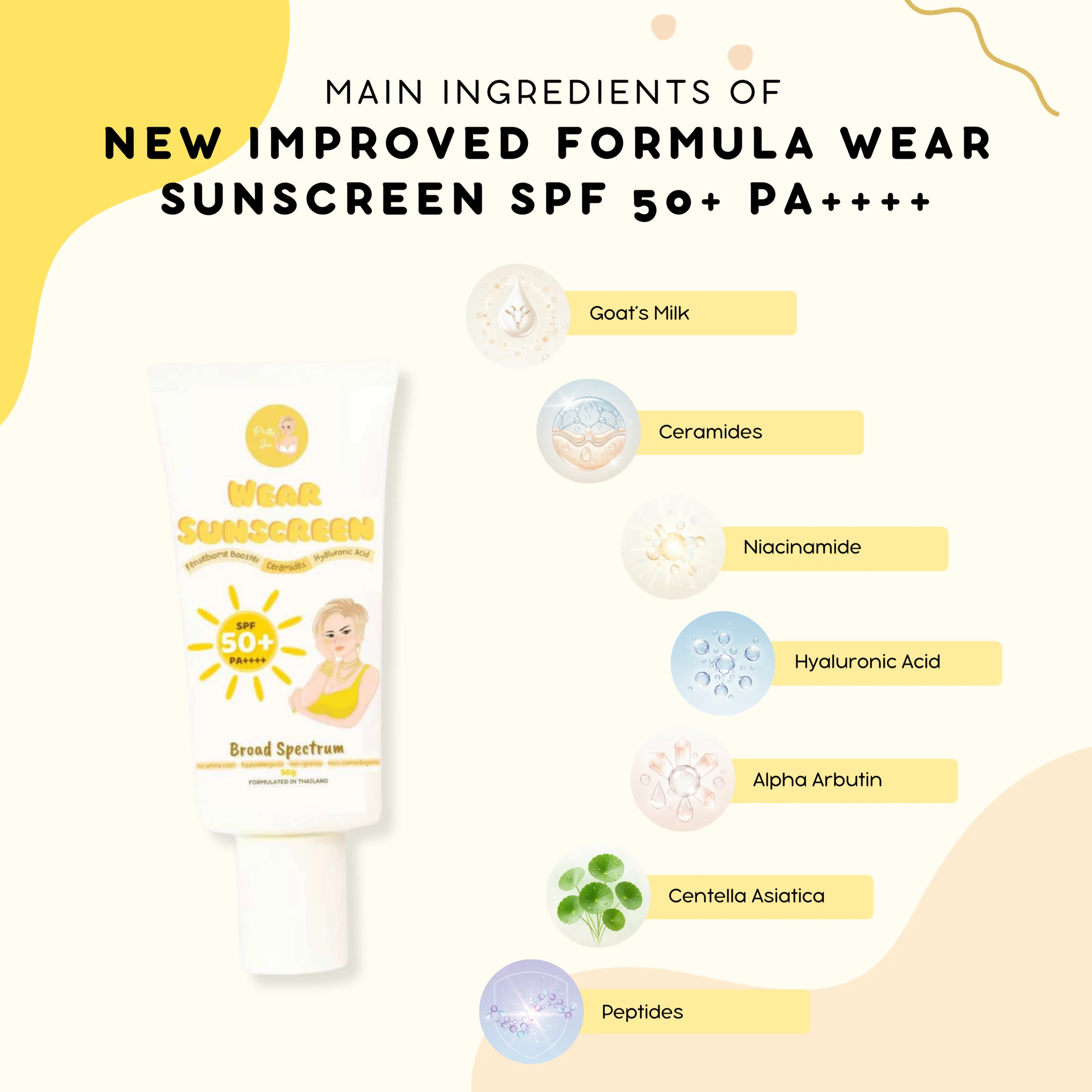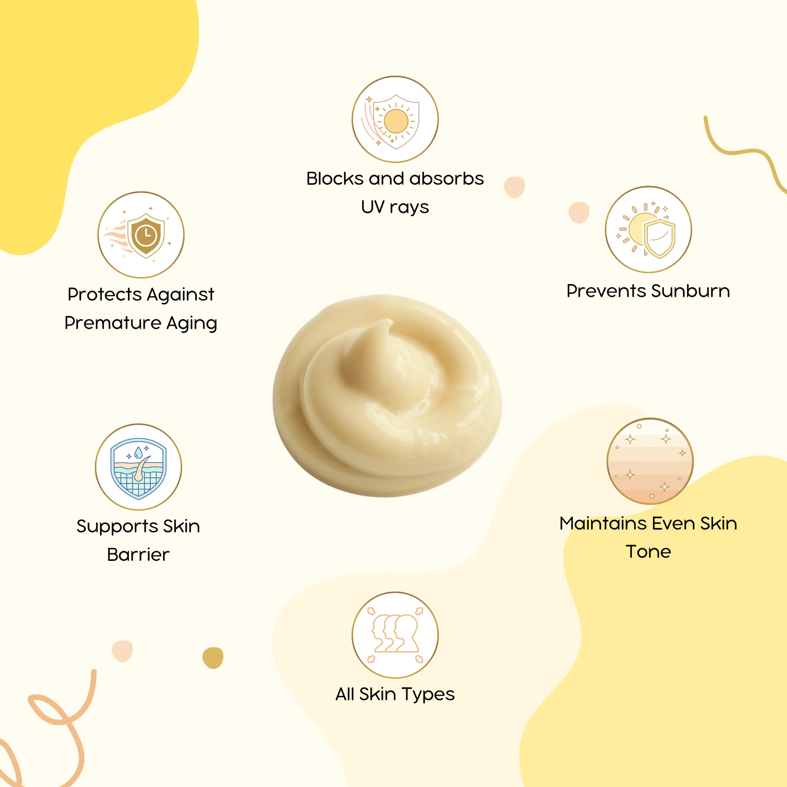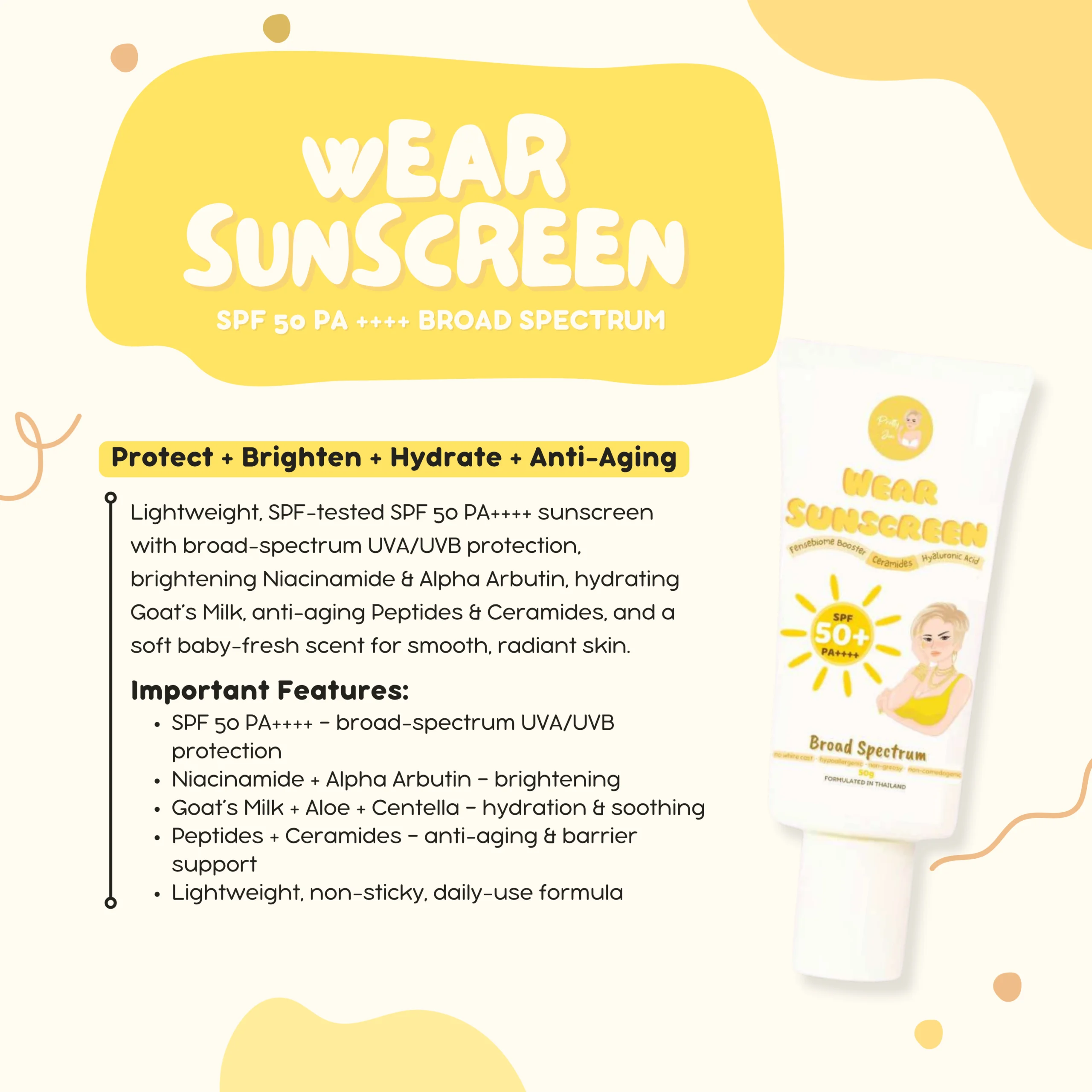 Lightweight, SPF-tested SPF 50 PA++++ sunscreen with broad-spectrum UVA/UVB protection, brightening Niacinamide & Alpha Arbutin, hydrating Goat’s Milk, anti-aging Peptides & Ceramides, and a soft baby-fresh scent for smooth, radiant skin.